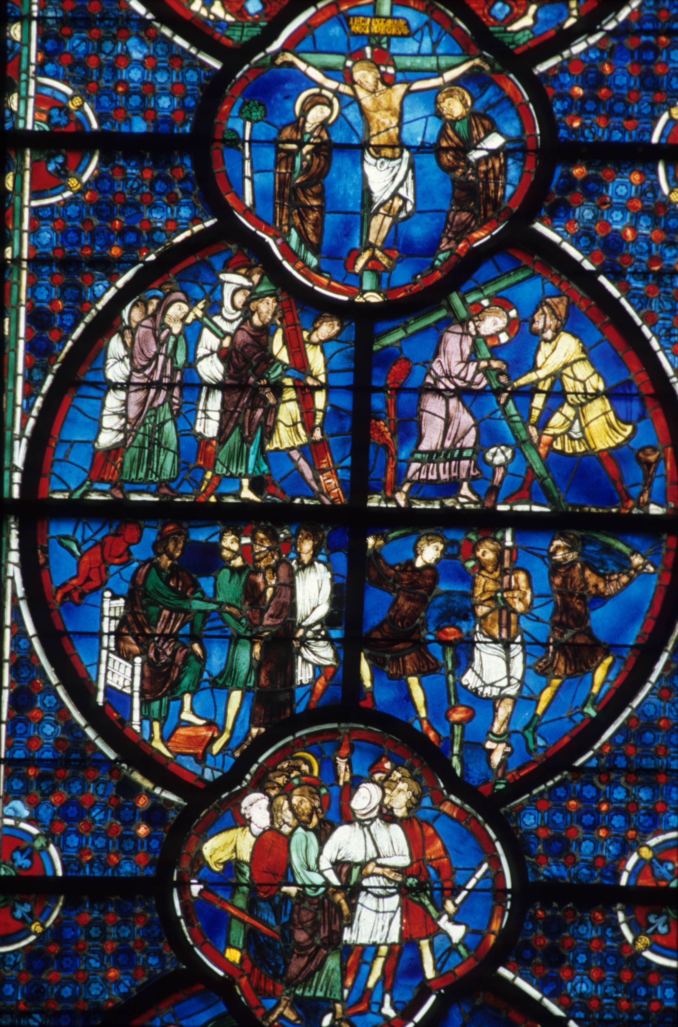Scènes : flagellation du Christ ; comparution devant Pilate ; Crucifixion ; arrestation du Christ ; portement de croix