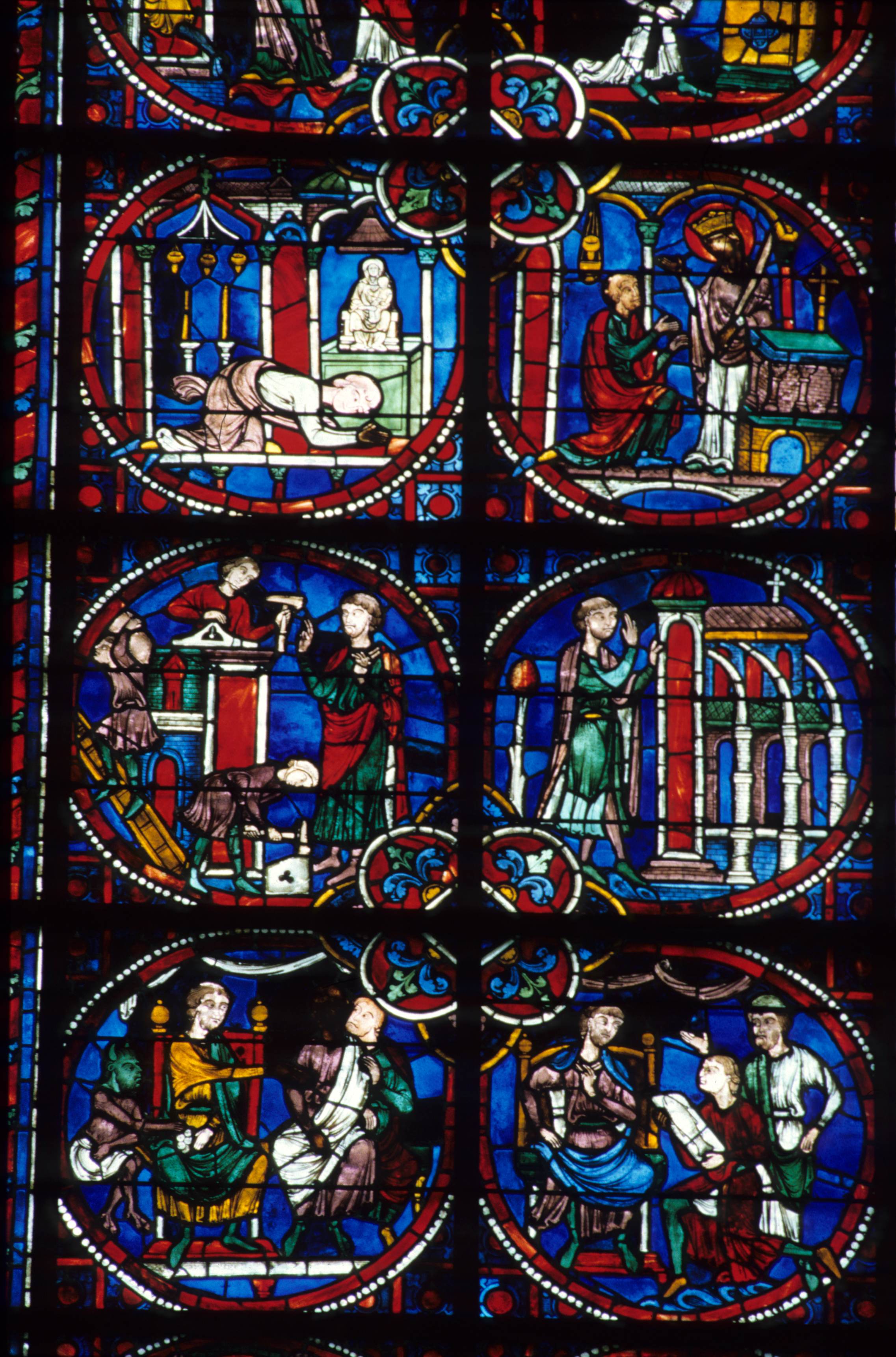 Description : vue d'ensemble : Théophile recevant des présents, Théophile faisant construire une église, Théophile en prière