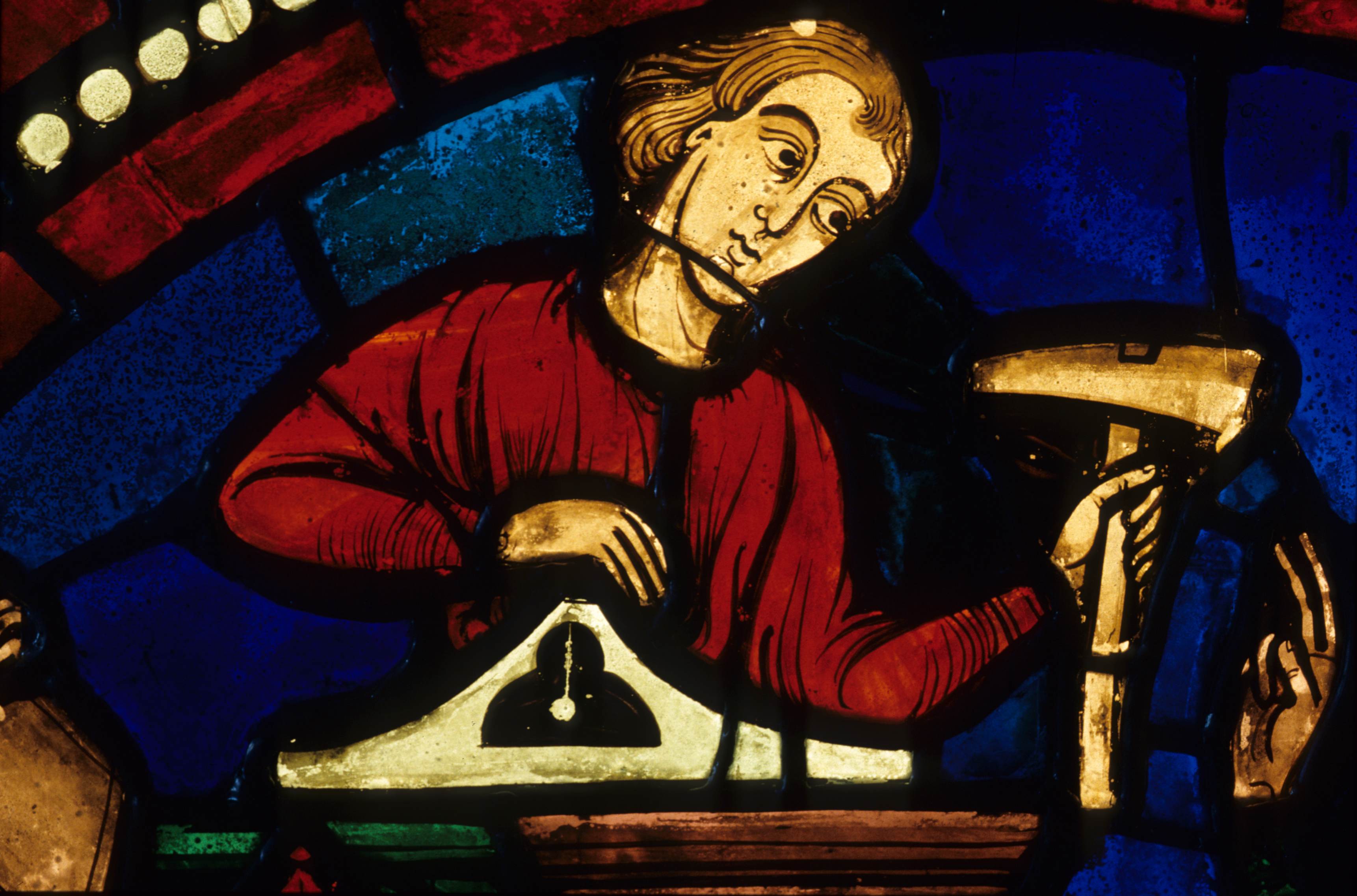 Description : Théophile fait construire une église : un maçon tenant un niveau à plomb
