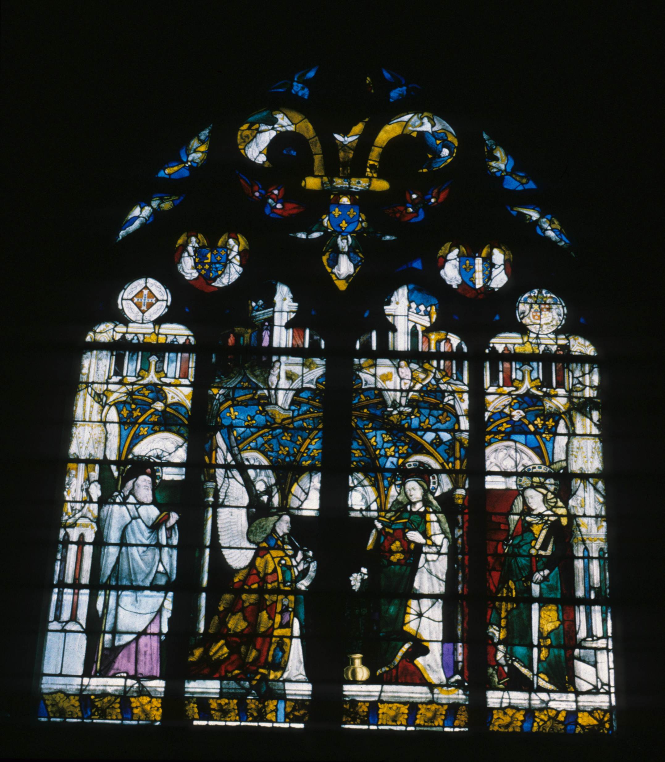Description : vue d'ensemble : Annonciation entre saint Jacques et sainte Catherine, prophètes, anges. Armes de France (Charles VII), du dauphin (futur Louis XI) et de Marie d'Anjou, armes des Laubépine