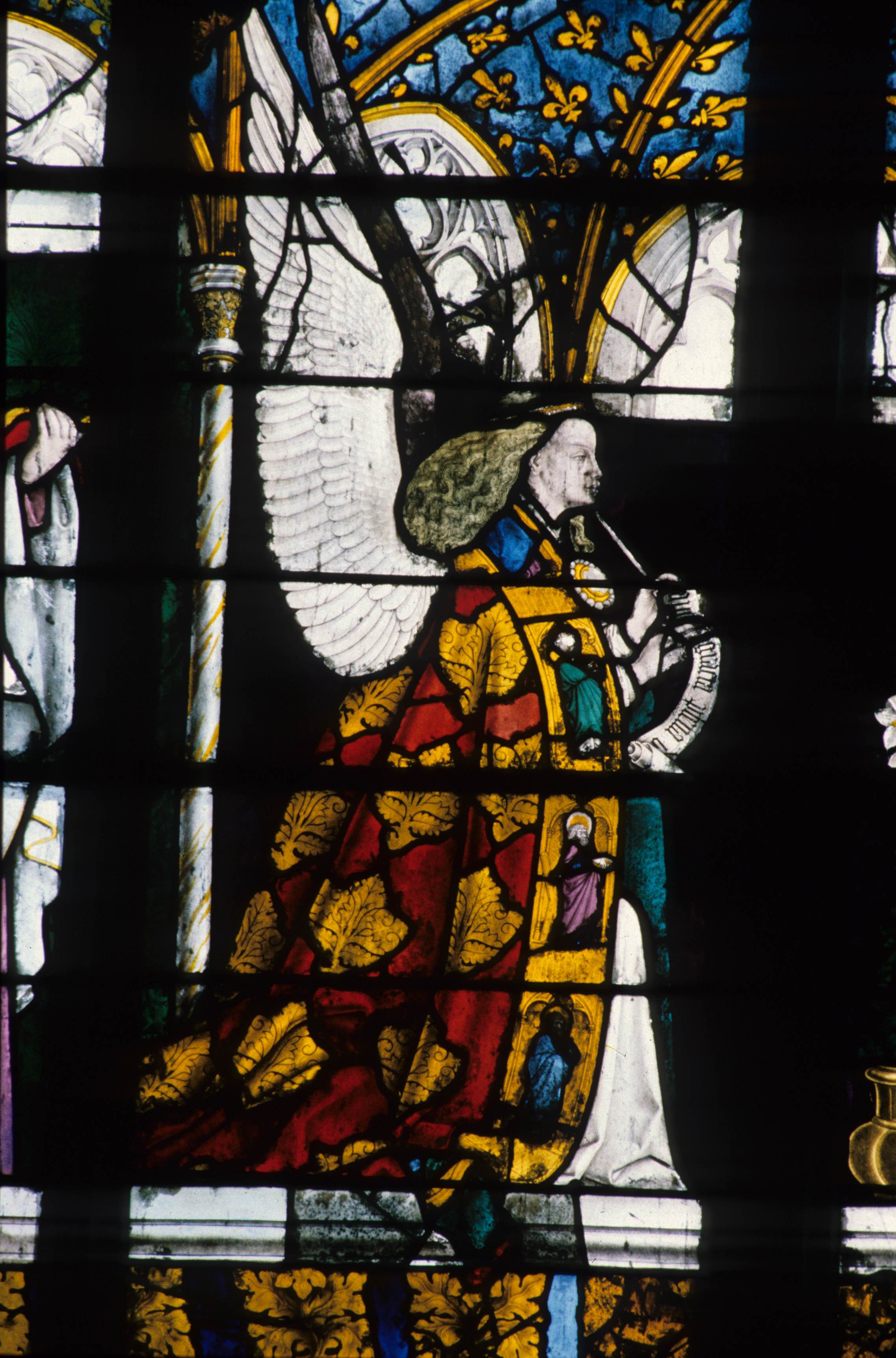 Description : Annonciation : l'archange Gabriel. Armes de France (Charles VII)