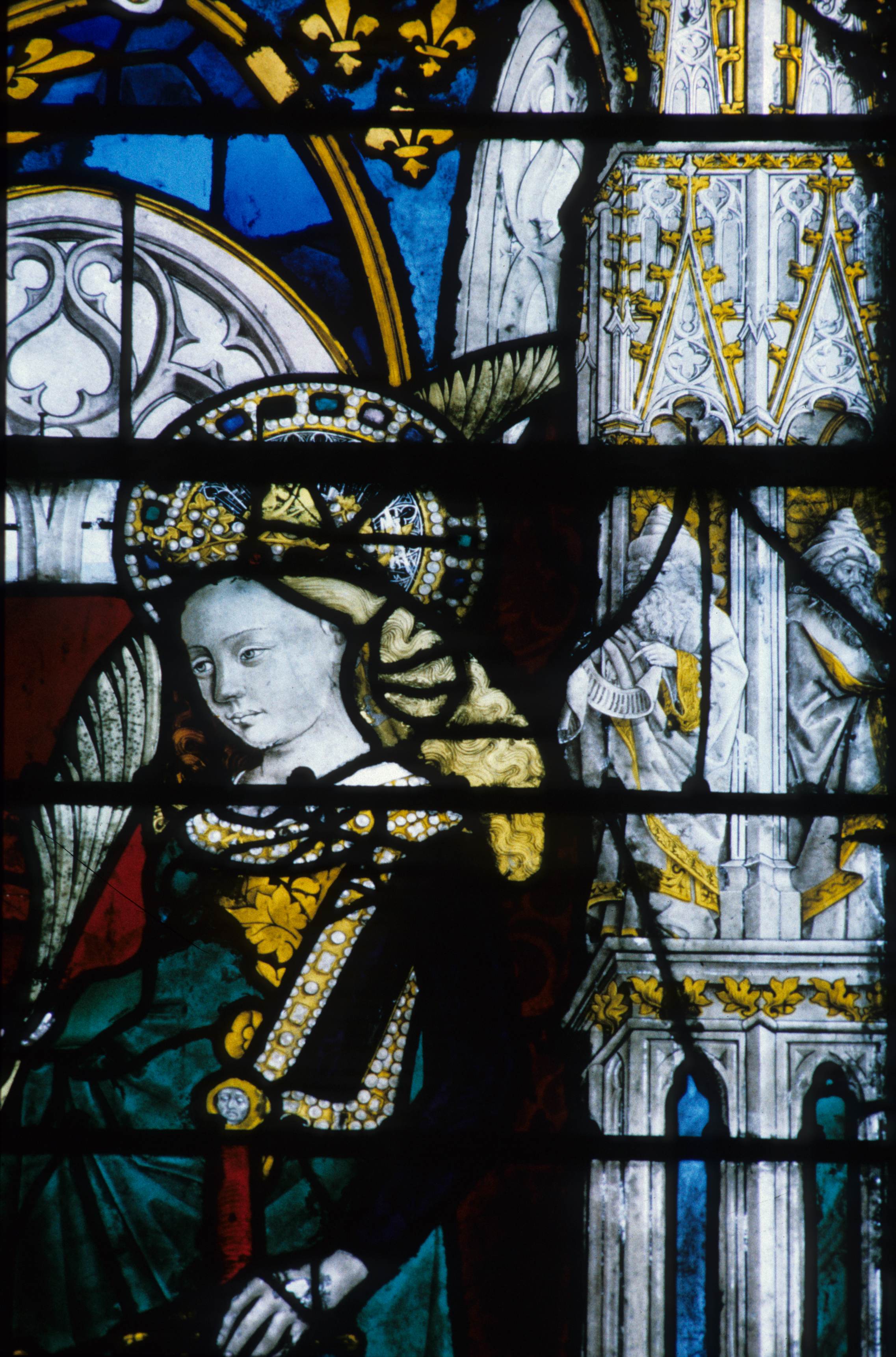 Description : sainte Catherine tenant une palme. Prophètes . Armes de France (Charles VII)