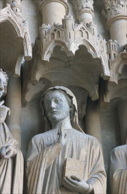 Titre : Amiens, Notre-Dame - Portail du Couronnement de la Vierge, ébrasement droit, niveau des statues : Annonciation, Visitation et présentation au Temple