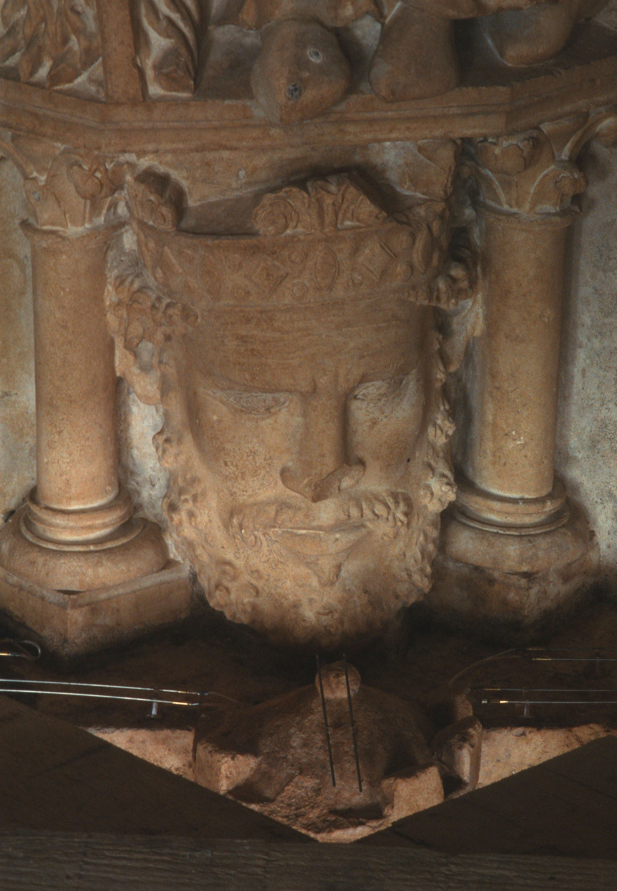 Chartres, Notre-Dame - Porche nord, portail de droite, voussure, sommier : tête de roi
