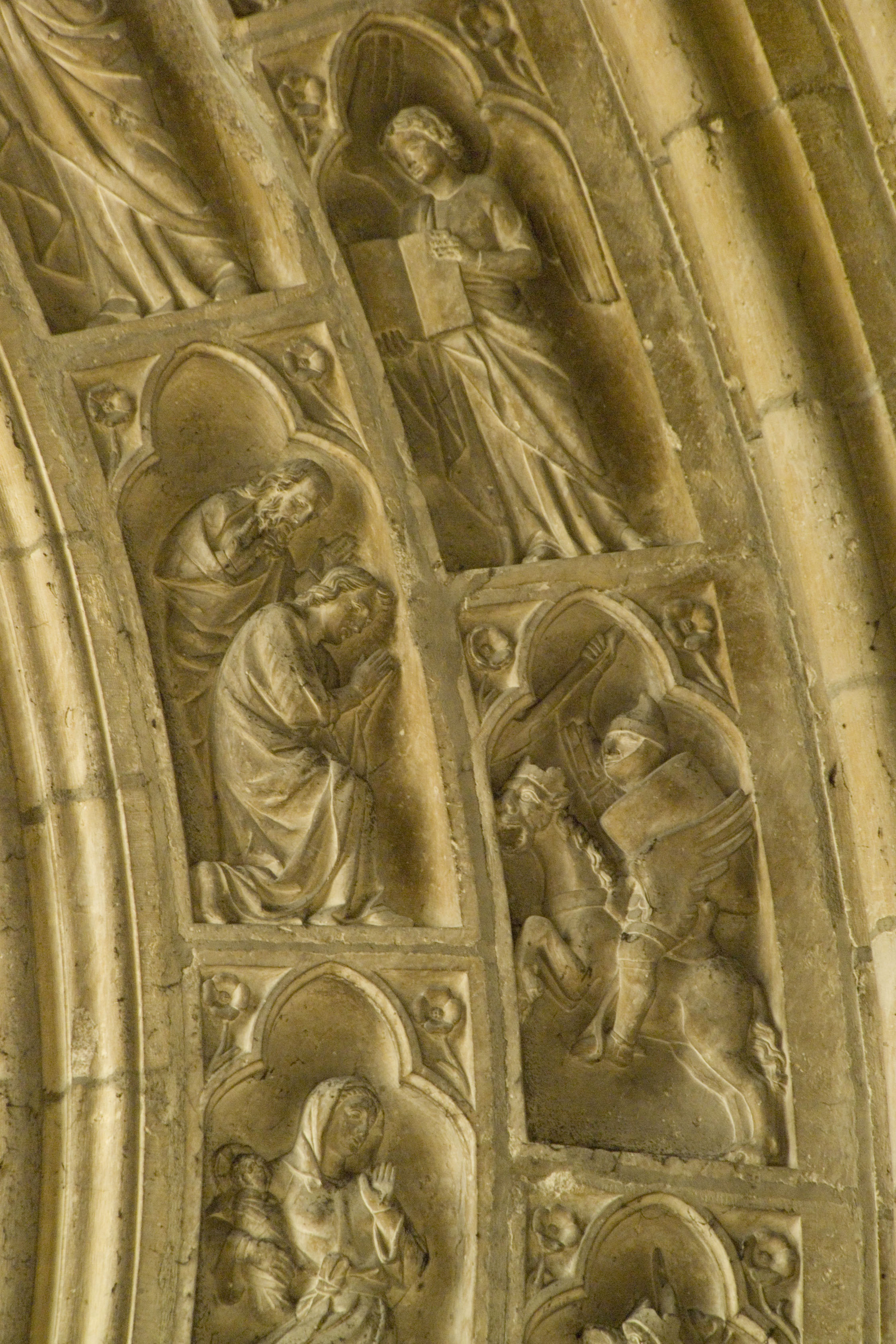 Reims, Notre-Dame - Revers de la façade occidentale, portail sud, archivolte, détails : les deux témoins ou les anges de la vengeance de l'Euphrate (?) ; et l'ange aux pieds-colonnes apporte le livre prophétique