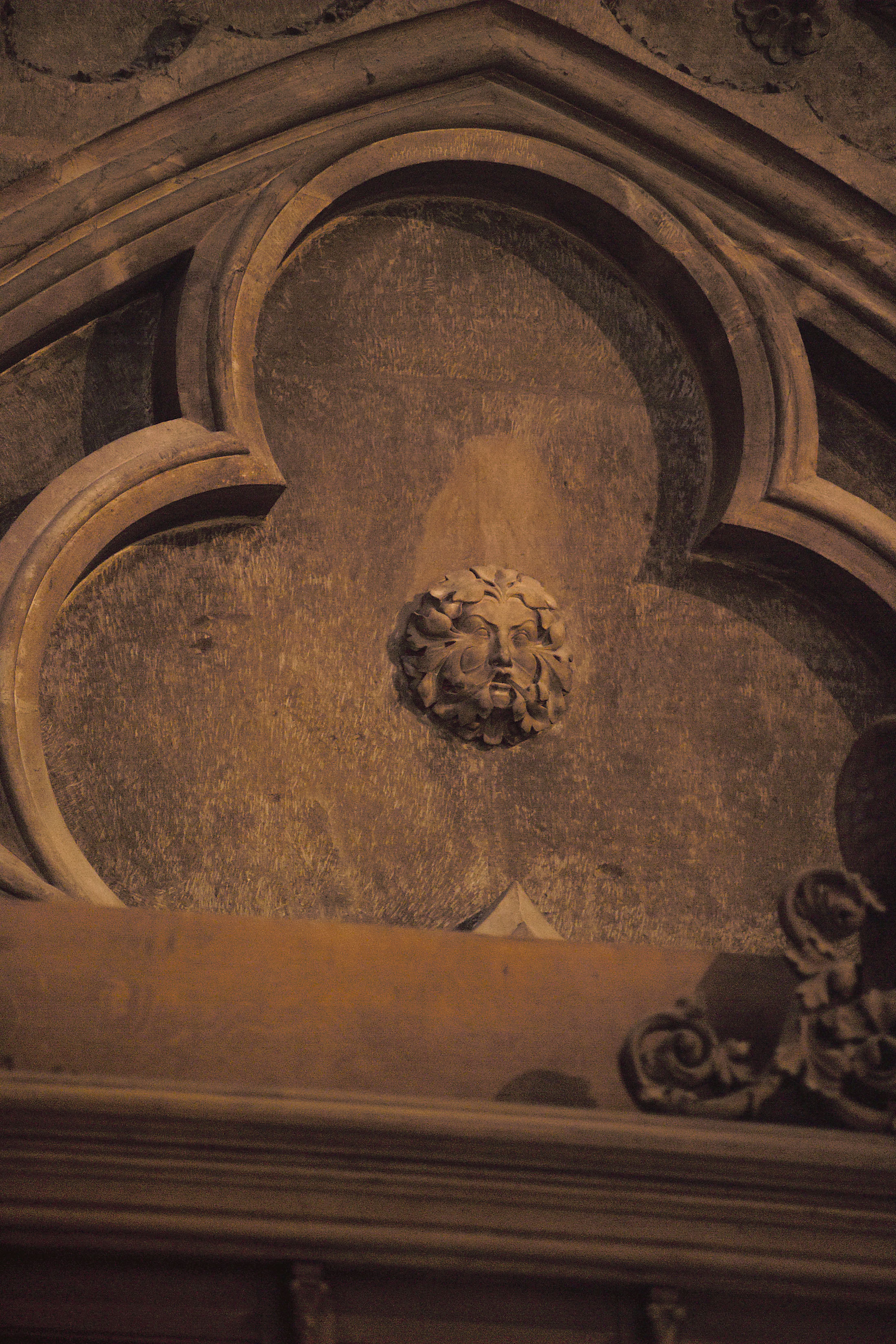 Paris, Notre-Dame - Bras sud du transept, revers de façade, niveau du portail, détail : masque feuillu
